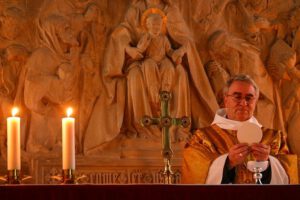 In der Heiligen Messe, in den Lesungen und im Evangelium, bist DU mit dem Vater, Sohn und Heiligen Geist das Allerheiligste, der Altar und Mittelpunkt der betenden Gemeinden unter uns, DEINEN Brüdern und Schwestern. DU bist allezeit als Gottes- und Menschensohn in uns, um uns über und unter uns. DU erneuerst DEIN Liebeswerk, nimmst das Himmelsbrot, alles was Gottes ist und unsere Gaben in DEINE ehrwürdigen Hände. DU dankst dem Vater, segnest sie zum Lobpreis, und teilst sie als DEINEN Leib zur Speise für uns alle aus. Nach dem Mahle nimmst DU den Kelch des neuen Bundes in DEINE Hände, dankst und segnest den Gnadenwein, als das hochheilige Blut DEINES, unseres und aller Geschöpfe Leidens und Sterbens, und reichst ihn allen zur Vergebung der Sünden zum Trank hin.